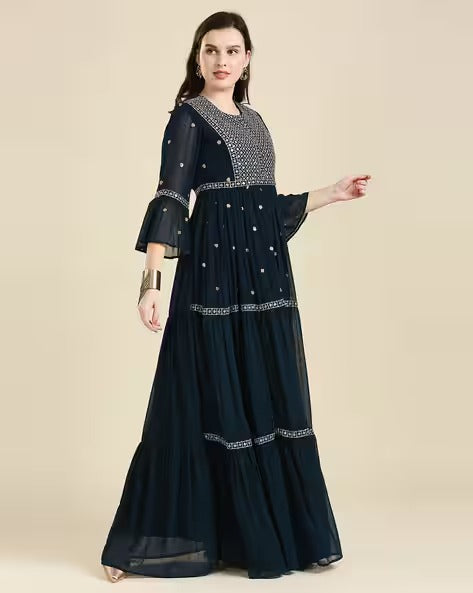 Embellished Round-Neck Tiered Dress – elegant, flowy, and perfect for festive or party wear. Comfortable fit with stylish tiers and subtle sparkle.