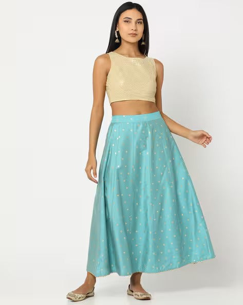 Elegant Foil Print Panelled Flared Skirt – featuring a graceful flared silhouette, shimmering foil print, and festive charm. Perfect for weddings & ethnic occasions.