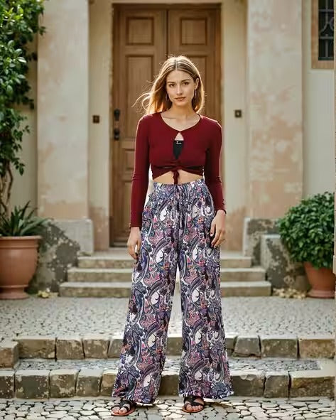 Stylish High Rise Paisley Print Palazzos with a comfy smocked waist & relaxed fit. Perfect for casual days, lounging, or effortless chic looks.