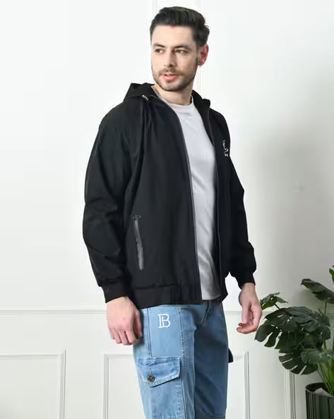Men Regular Fit Hodded Jacket with Zipper Pockets