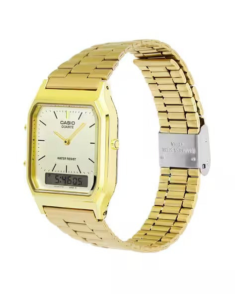 Casio Men’s AQ-230GA-9DMQD Watch – Water-resistant, dual-display (analogue + digital), gold-tone classic design. Perfect blend of style & function.