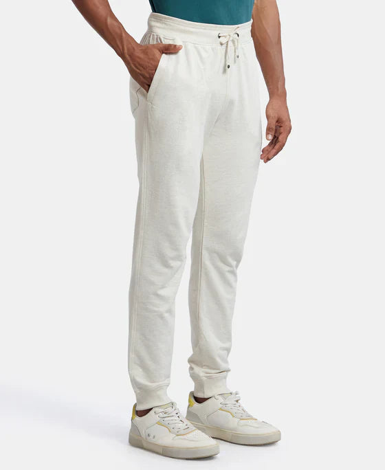 Stay stylish & comfy in Cream Melange Slim Fit Joggers. Made from super combed cotton with side pockets & cuffed hems—perfect for everyday wear.
