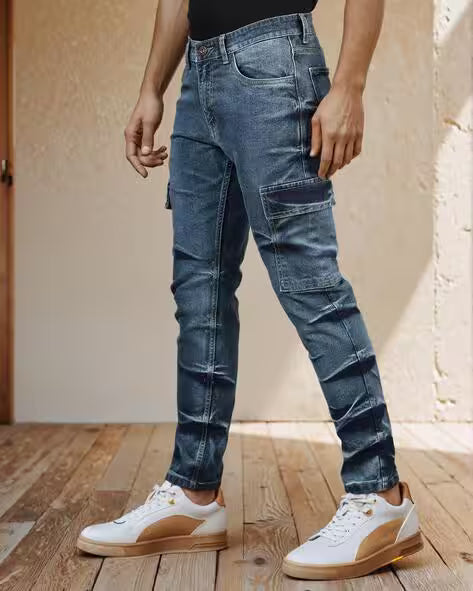 Slim Fit Ankle Length Cargo Jeans with creasing detail, functional pockets & modern streetwear vibes. Perfect blend of comfort & style!