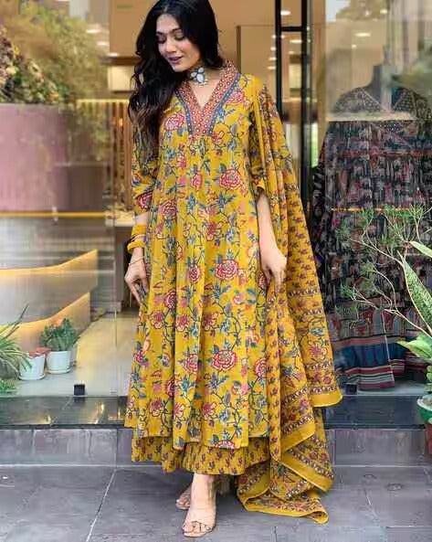 Women’s Floral Print Anarkali Suit Set – elegant, comfortable & perfect for festive wear. Includes kurta, pants & dupatta.