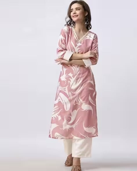 Women’s Printed V-Neck Straight Kurti – elegant print, breathable fabric & flattering fit. Perfect for casual & office wear.