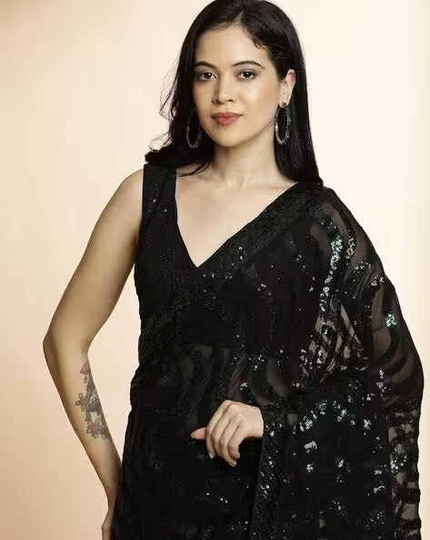 Women Pure Georgette Sequin Embroidered Black Saree Saree